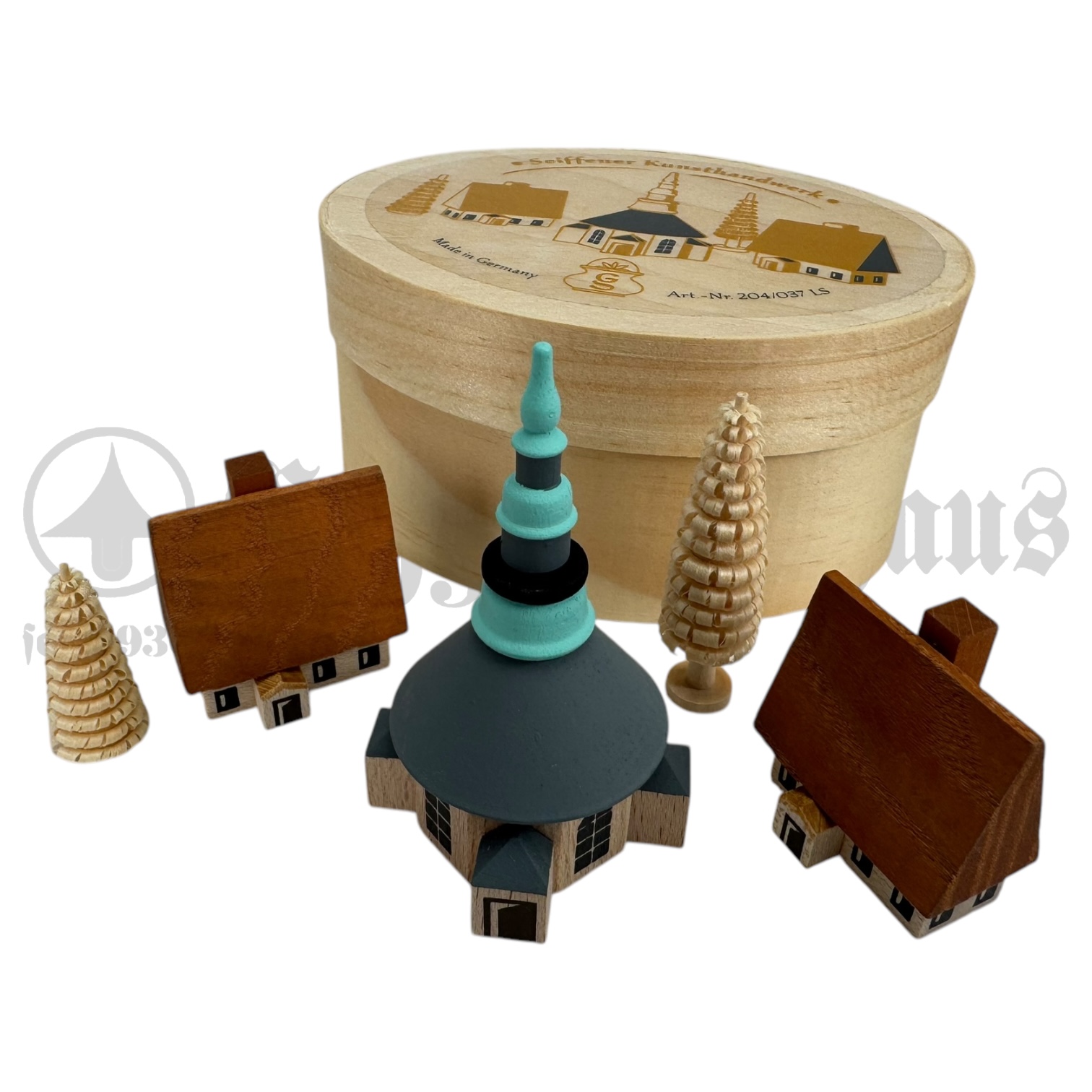 - 5-teiliges Set (Kirche, 2 Häuser, 2 Ringelbäume)