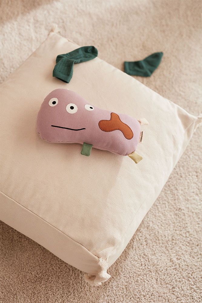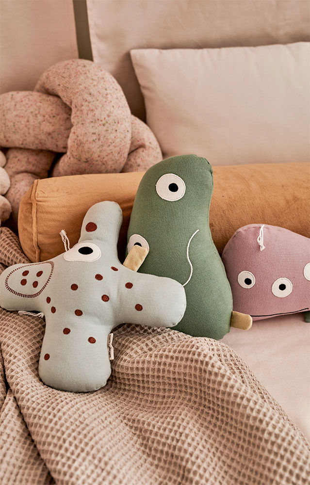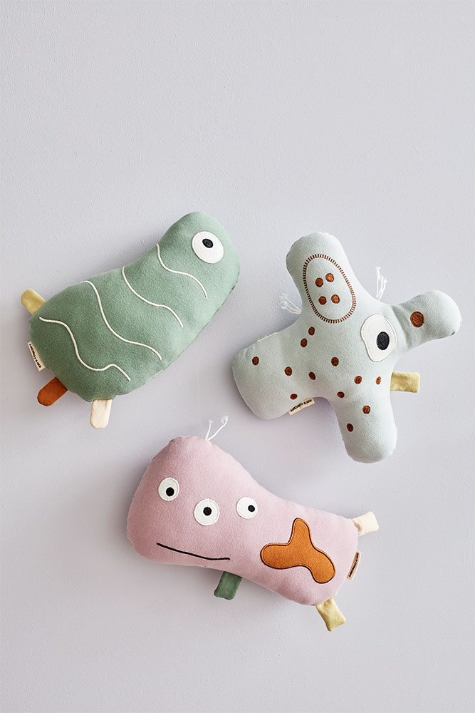 Ohne Mikoorganismen wäre unser Leben undenkbar – Kids Concept hat versucht ihnen ein Gesicht und einen Körper zu geben und daraus entstand die Serie der ‘MicroNeos’. Sie besteht aus drei verschiedenen Mikroorganismen und jeder hat eine besonders wichtige Aufgabe für uns Menschen oder die Umwelt. Das hier ist LaCilla, das lila Wunder, als Kuschelfigur. Sie hilft uns bei der Zersetzung und Verdauung von Lebensmitteln.
