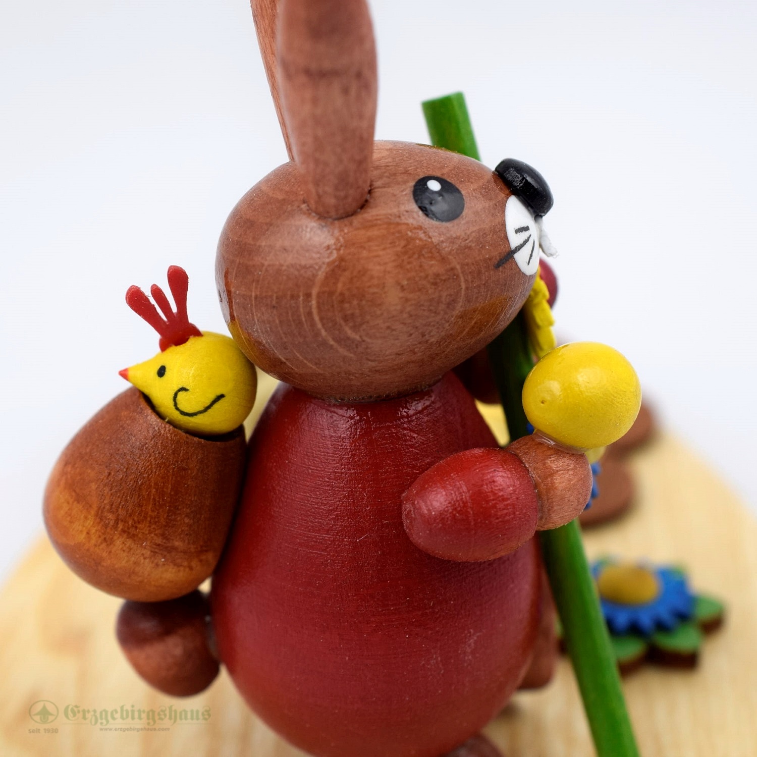 - Hase rot lackiert mit Küken im Rucksack und Blumenstab