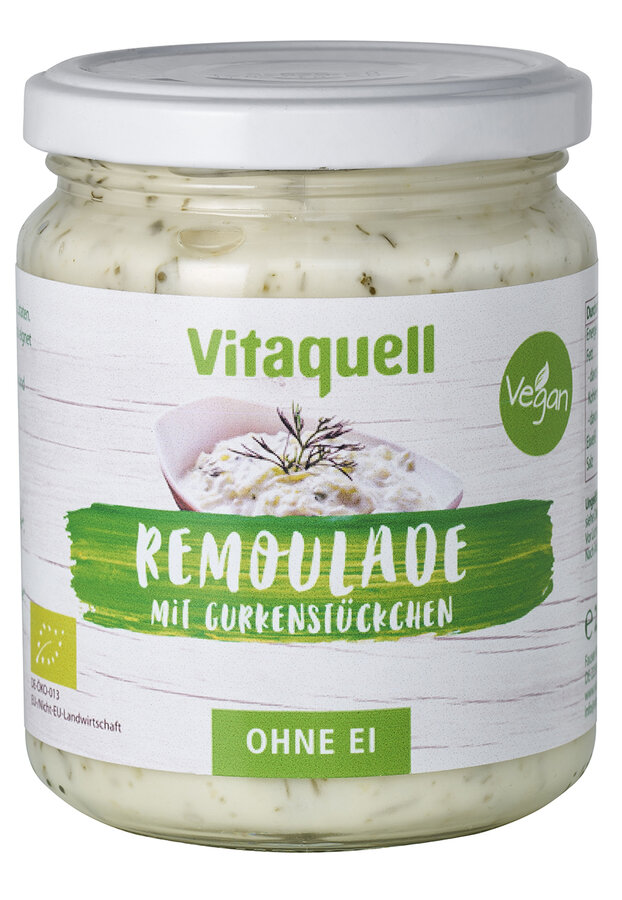 In unsere vegane Remoulade kommen nur die besten Bio Zutaten. Mit Gurkenstückchen und ihrem mildenwürzigen