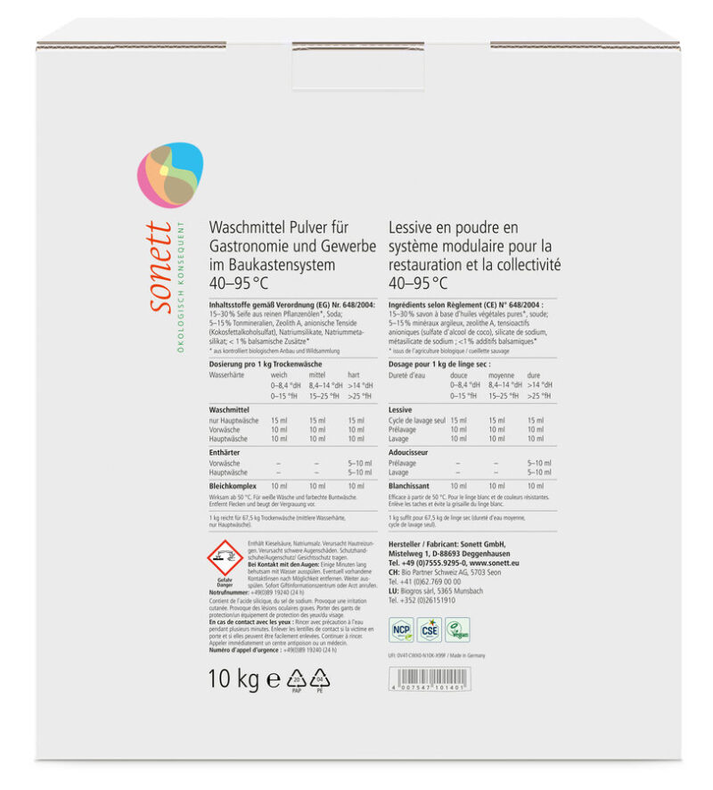 In diesem Waschmittel für den gewerblichen Bereich ist die Pflanzenseife durch Fettalkoholsulfat so verstärkt, dass dieses Waschpulver auch einsetzbar ist in Kombination mit Enthärter, Bleichkomplex und Waschverstärker in Bereichen sehr starker Verschmutzungen: bei Wäsche im Restaurant- und Hotelbereich, in Heimen, Bauernhöfen und Gewerbebetrieben. Die ausgezeichneten Waschergebnisse werden in diesem Waschmittel ohne Enzyme, synthetische Aktivatoren und optische Aufheller erreicht.
